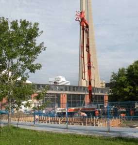 In the pictures at the upper left and middle above, we see a gigantic concrete pump being used to fill the foundation forms of the miniature railway depot building. In the picture at the upper right above, we see the same concrete pump arching high overhead to fill the formed sections of roadway through the park centre.