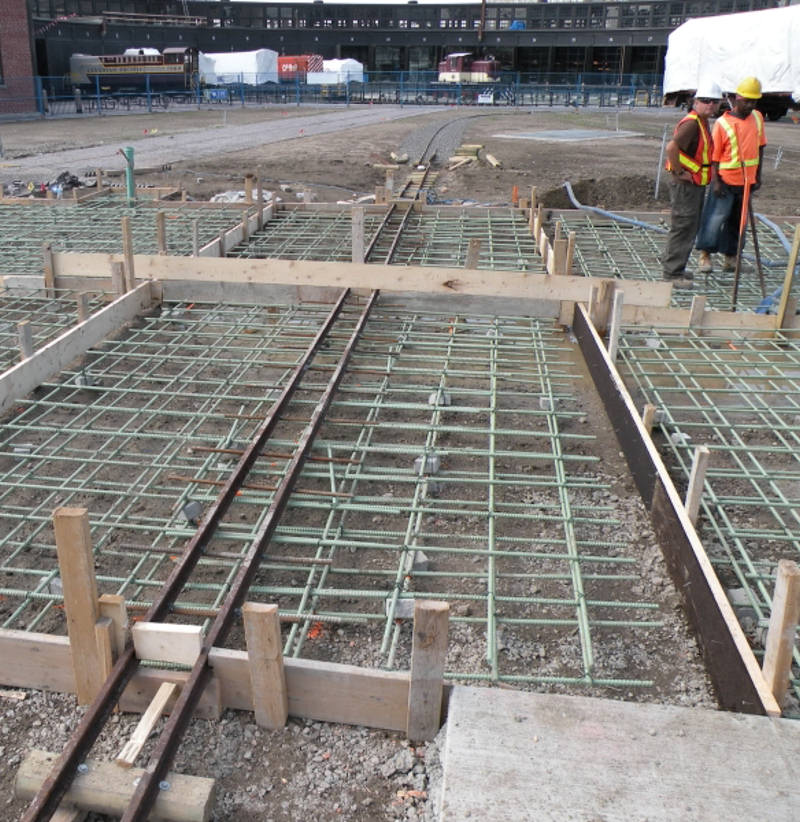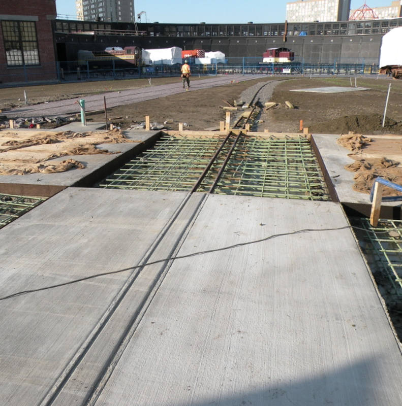 In the pictures below we see the area where the miniature railway track crosses the park centre roadway. These photos were taken before and after the first concrete pour in this area.