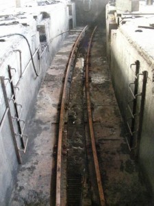 In the picture to the left of the middle, we see that inside the roundhouse, on Wednesday and Thursday a contracting team vacuumed, washed and generally cleaned out all the old water passages, drains and sumps. The large driving-wheel drop pit was drained and now has been cleaned out. This pit will be closed with a steel lid and concrete cap, everything within will be left in place.
