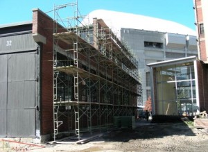 In the picture at left, scaffolding was erected on Thursday to allow remedial work on the end wall of stall 32. The brick will be re-pointed, the windows repaired and the roof edge flashing replaced.