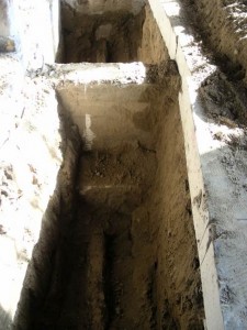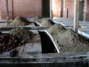 In the picture at the right of middle, the floor between stalls 18 and 26 has been opened up to allow installation of new storm and sanitary drains. In addition to this, in the picture to the right, the original 1929 clay tile drains between the service pits are deteriorated and are to be replaced.
