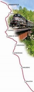 The Credit Valley Explorer is a very scenic tourist attraction just north of Toronto which operates excursion trains on the OBRY between Orangeville and Snelgrove on the Northern edge of Brampton. The route passes through the dramatic scenery of the Forks of the Credit.