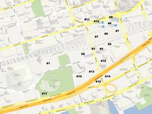 I‘ve organized this development tour in a somewhat clockwise route beginning in front of Roundhouse Park on the north side of Bremner and then heading east to the ACC, north to Union Station, then south and west back to the Roundhouse. The projects are numbered and can be located on the modified Google map. Many of the links below the name of each project will bring you to the UrbanToronto.ca website, which is an excellent database of ongoing construction projects in the city. Additional links on their site will take you to the individual developers if you wish more information on their buildings.