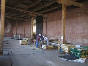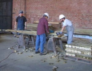 The miniature railway planned for Roundhouse Park will require many wooden ties once we assemble the track. On Saturday, a nine-man TRHA team set up two workstations and in three hours cut over 1,700 new ties.