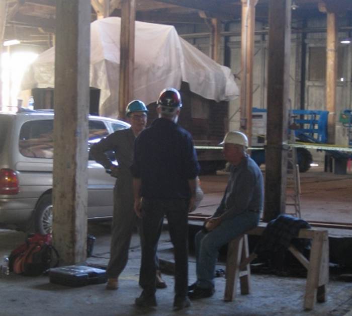 The picture at the left shows the work area at the halfway point. In the middle picture, we find Ron, Wilson and Lance (left to right) operate a cutting station. Eight foot long landscaping “mini ties” were cut down to nineteen inch long “even more mini” ties for the railway. In the picture at right, Arno, Michael G. and Mike S. take a short break and discuss what is next.