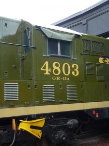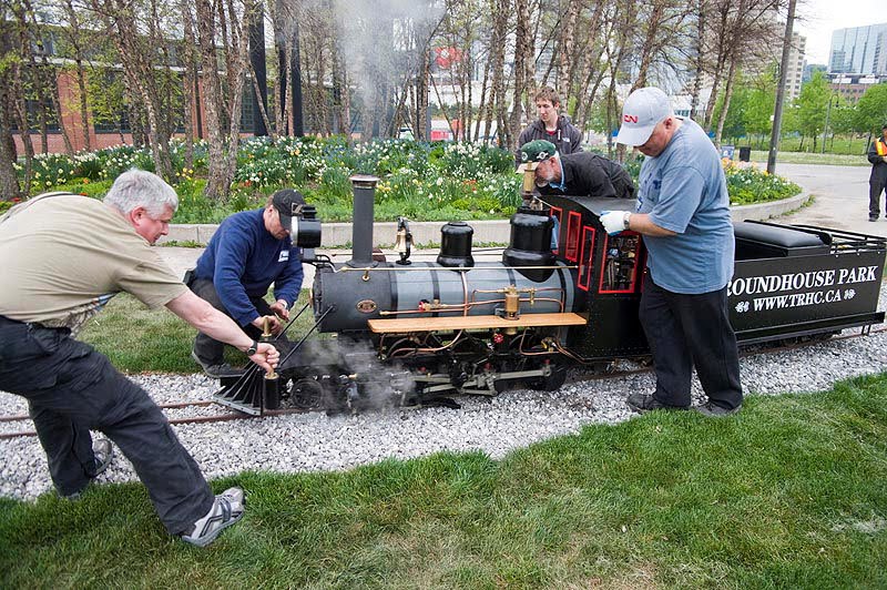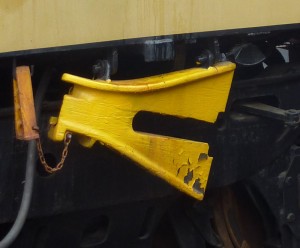 The two photos shown above (by Stephen Gardiner) show how we do it at Roundhouse Park. The black steel plate forms a ramp with guides intended to allow the locomotive to be pushed as shown or winched back into place in one move without the need for lifting of any kind. Full-sized locomotives (like our #4803 and #7020) carry heavy cast-steel devices (see photos below of #4803’s rerailer) using similar principles to deal with one axle at a time.