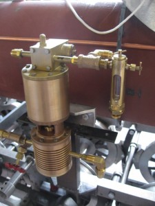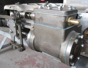 This picture is of the water pump which is used to pump water under pressure into the boiler to maintain an appropriate amount of water in the boiler as it is used up as steam. Steam engines often have as many as three systems to pump water into the boiler: steam driven water pumps, axle driven water pumps and steam-driven injectors.