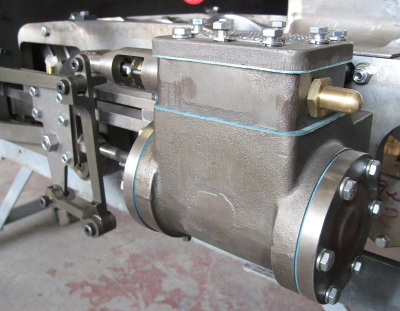 Here we see the steam cylinder assembly in the first picture. Steam at over 100 pounds per square inch (psi) pressure is distributed to each cylinder by the valve in the top of this assembly through the rod at the upper right. The steam then pushes on a piston in the lower part of the assembly which is connected to the drive rod at the lower left which turns the driving wheels.