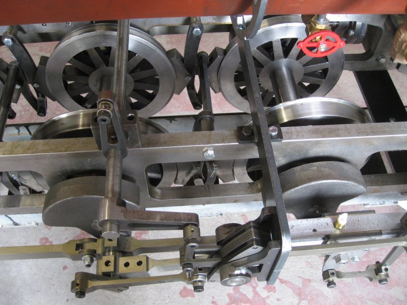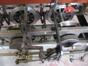 In this picture, we see the chassis and driving wheels. On most steam engines the driving wheels are found on the outside of the frames. But in our engine, they are inside the frames which was commonly done for engines on narrow gauge track, Note the heavy counterweights on the axles. The assembly of linkages in front of the wheels comprise the “valve gear” which are designed to turn the rotary motion of the wheels into just the right movement of the steam valve mentioned early to provide perfect timing for the injection of steam into the cylinders.