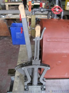The final picture is of the Johnson bar and brake lever. The smaller lever, the Johnson Bar or Reverser controls the forward and reverse motion of the engine by adjusting the valve gear appropriately. The taller lever controls the braking system for the locomotive.