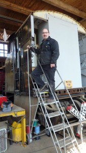 Bill Kaufman is the enthusiast who developed our U33C Diesel Cab Simulator – a 19 year long project! Bill has also generously donated a number of items to help us restore our diesel cabs. This past weekend, we picked up a set of portable stairs which will be very useful. They are easily rolled about and assembled by one person and yet store in a small space. We couldn’t resist assembling the stairs, rolling them up against our F7 Cab and then asking Bill to pose at the top!