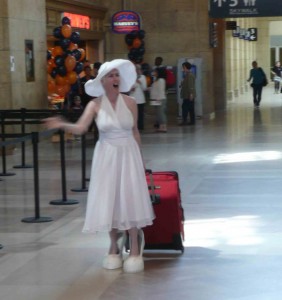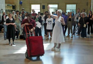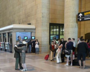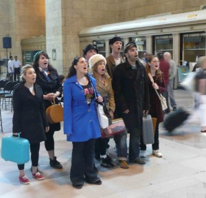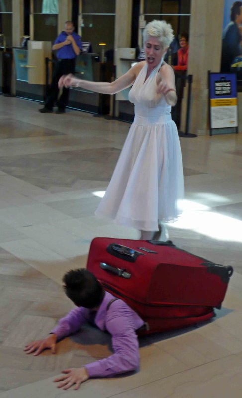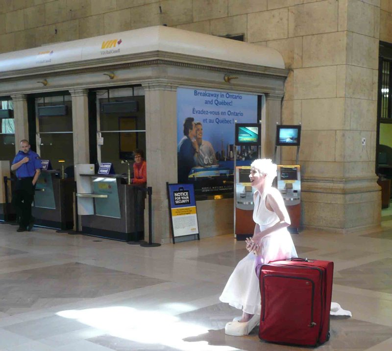 One of the most intriguing numbers was “Suite Case,” where a soprano sings while dragging out a large suitcase. In the picture at the left below we see here making her entry from the waiting room at the west end of the great Hall. After she pauses, a hand emerges from the suitcase ……and tries to crawl away. In the final picture, a Red Cap (actually Laird Macdonald, the DD coordinator at Union Station) is summoned to carry the suitcase away for loading onto a baggage car.