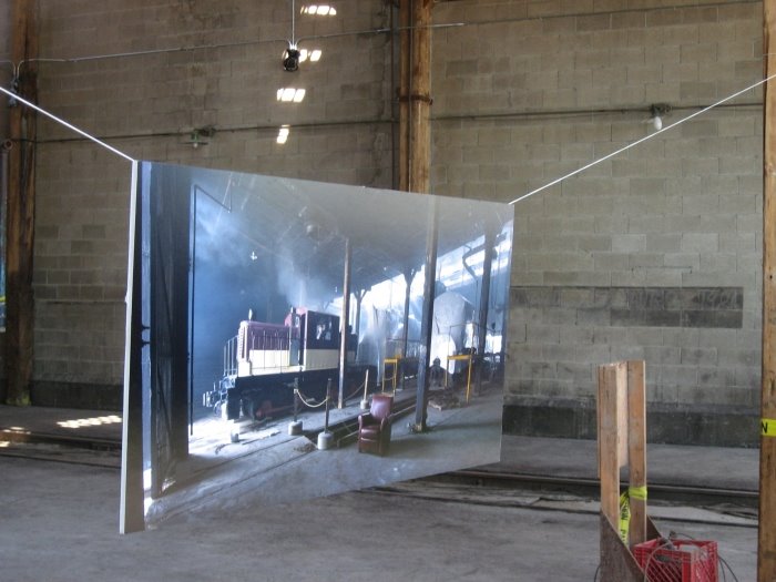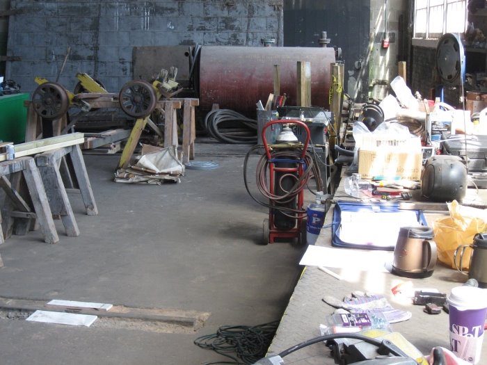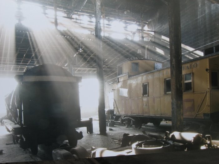 Visitors to the roundhouse this year had the unique oppportunity to see the newly renovated interior with several concrete firewalls removed allowing the visitor to see much of the roundhouse in one sweeping view. In the picture at left, we see what the Doors Open visitor saw as they entered the roundhouse. The TRHA had mounted a picture display at the end of this track for the visitors to enjoy. In the next picture, we see one of the many fine photograhs taken by Norm Betts, the professional photograper who has been hired to chronicle the roundhouse restoration in pictures. These photos were blown up as shown here and hung throughout the roundhouse. The next picture, also hung up for the tour, is another of Norm Betts’ fine works which captures the ambience of a scene including the vinegar car and the caboose. Seen in the right hand picture is the final stop on the tour of the interior. This is the area in the museum where the TRHA shop has established a workshop area to allow our teams of volunteers to continue the work of restoring the museum’s artifacts.