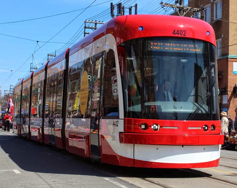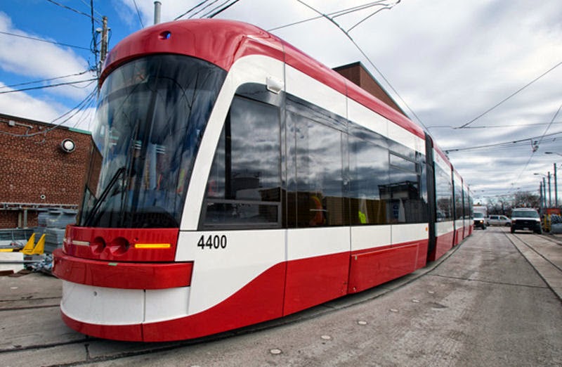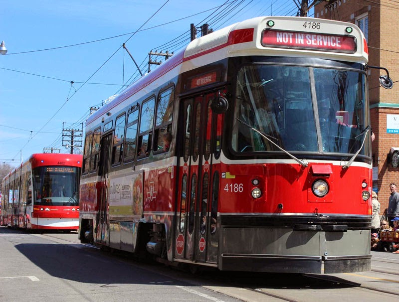 Toronto has a rich history of rail-based passenger transportation systems on its city streets. The major player has of course been the Toronto Transit Commission (TTC). On Easter Sunday the TTC took the opportunity to bring out four generations of streetcars to participate in the Toronto Beaches Lions Easter Parade on Queen Street West in the Beach area of Toronto. This included the first public operational appearance of the first of their newest streetcar as shown above in a TTC photo!