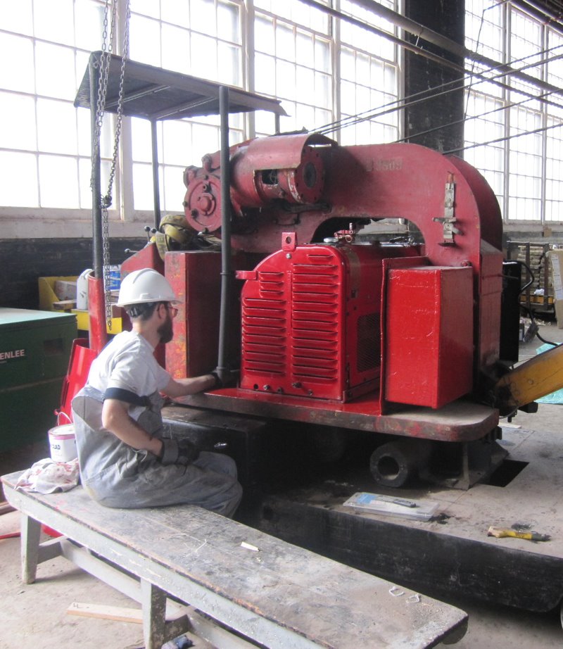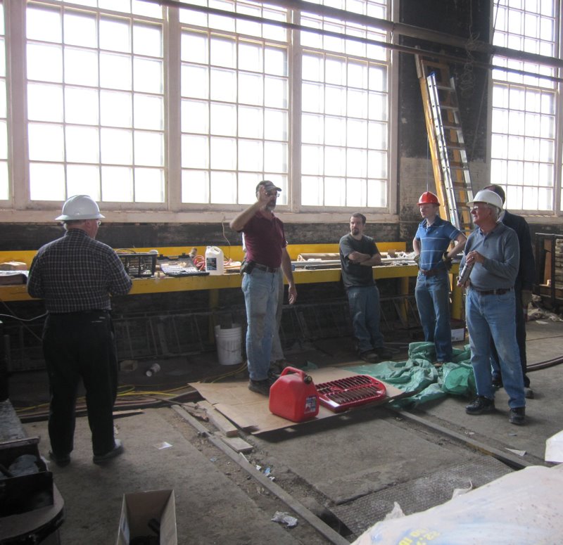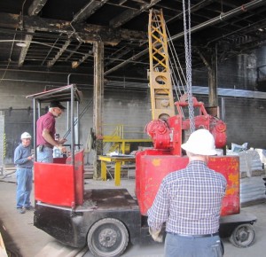 Last weekend was a very busy one for TRHA volunteer teams. In the first picture at the upper left, we find Michael Guy updating the team last Saturday on the work tasks to be tackled that day. In the middle photo, we see one the major tasks – the reinstallation of the engine in Elwell the Crane. As readers of our News will recall, we had sent the engine out for a much needed overhaul. In the photo at right, we find Michael putting the re-energized Elwell to work on the first of a number of challenging jobs tackled last weekend.