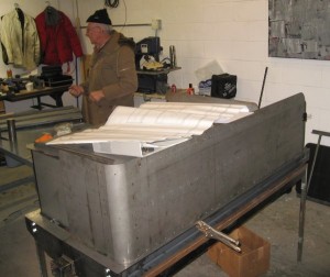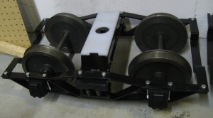 In the picture at the above right, we see Pat, Michael and Michael working on the riveting of the tender body. In the middle picture, we see the dry-fitted tender body. This picture gives you a good sense of the massive size of this tender. There are two stainless steels tanks in the tender, one for water and one for diesel fuel. In the right hand picture, we see one of the tender trucks which have already been assembled.