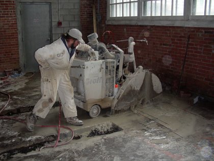 This week Steam Whistle Brewing began work in their expansion space – roundhouse stalls 12, 13, 14 – on the floor and sanitary drains. When complete, the space will hold a new tank farm, a cooler room and new staff facilities. A TRHA representative was on hand for much of this week to advise on heritage matters while the floor cutting was proceeding. As previously mentioned in this blog the 1929 structural drawings were located in the Toronto Archive a couple of weeks ago, these have now received the attention of the archive’s paper conservator and have been copied to a DVD. The information contained in the drawings was instrumental in avoiding inadvertent damage to the foundations during floor slab cutting.