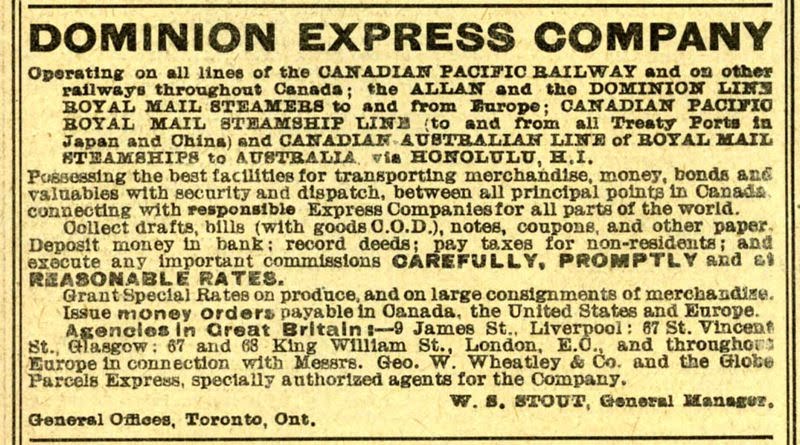 This advertisement for Dominion Express appeared in a 1901 CPR timetable.