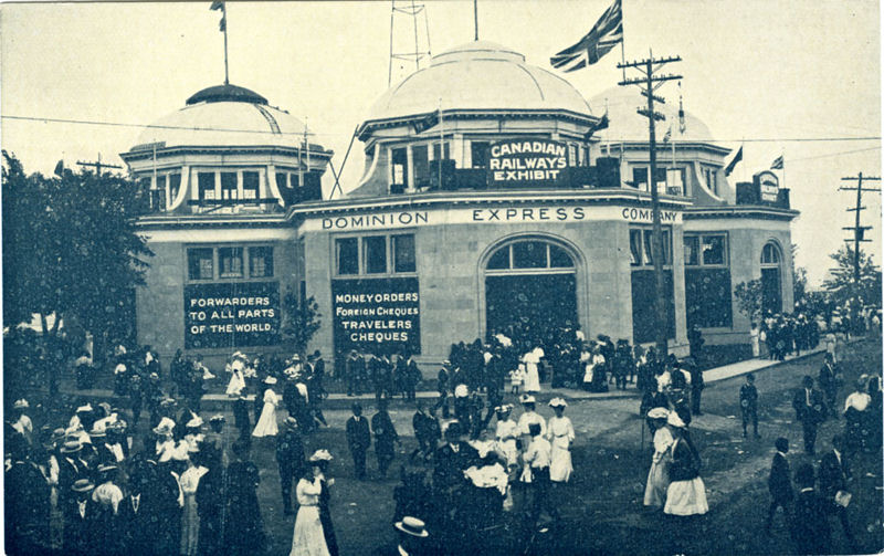 Dominion Express was prominently displayed at the Canadian National Exhibition in 1910. This was the Railways Building, which was built by Canada’s three major transcontinental (or soon to be) railways in 1907. The three domes covered three inter-connected pavilions for the Canadian Pacific, Grand Trunk and Canadian Northern railways. From 1907 to 1950, with the exception of a few years during WW2, the Railways Building exhibited innovative displays promoting the wide variety of services available from the railways. The structure became the Music Building in 1968. Following a fire in 1987, the building was restored and is now rented out to a commercial sound studio.