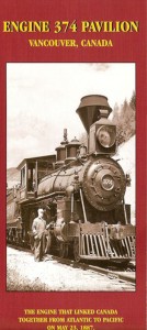 “Engine No. 374 was the steam engine which pulled the first transcontinental train to arrive in Vancouver, arriving on May 23, 1887. This happened as a year after its sister Engine No. 371 brought first Canadian Pacific Railway train to cross Canada into Port Moody. No. 374 was built by the CPR in 1886 and was one of eight similar 4-4-0 steam locomotives built that year in the CPR Montreal shops. While No. 371 was scrapped in 1915, No. 374 was completely rebuilt in 1914 and continued in service until 1945. It was then cosmetically restored to look similar to its original 1886 appearance and put on display at Kitsilano beach. It remained there until 1983 when it was moved to a warehouse on Granville Island and received a new round of restoration work. No. 374 was put on display on the turntable at the renovated CPR Drake Street roundhouse during Expo 86. In the 1990’s the roundhouse site was converted into a community centre as part of the Yaletown area redevelopment and a new building, the 374 Station Pavilion, was built to house and preserve No. 374.”