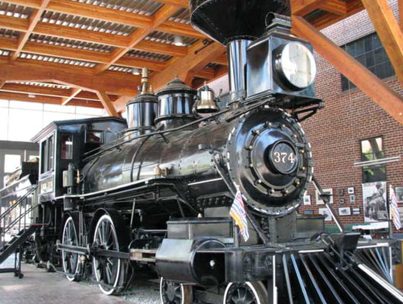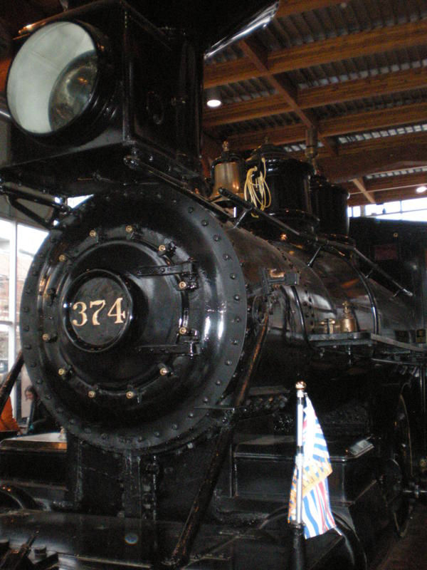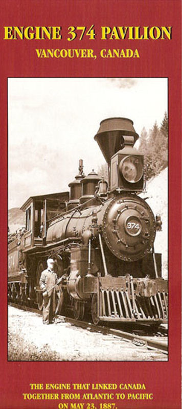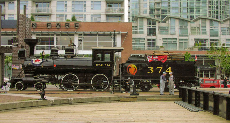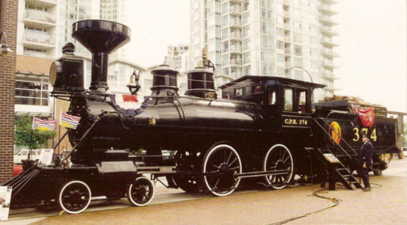 “Engine No. 374 was the steam engine which pulled the first transcontinental train to arrive in Vancouver, arriving on May 23, 1887. This happened as a year after its sister Engine No. 371 brought first Canadian Pacific Railway train to cross Canada into Port Moody. No. 374 was built by the CPR in 1886 and was one of eight similar 4-4-0 steam locomotives built that year in the CPR Montreal shops. While No. 371 was scrapped in 1915, No. 374 was completely rebuilt in 1914 and continued in service until 1945. It was then cosmetically restored to look similar to its original 1886 appearance and put on display at Kitsilano beach. It remained there until 1983 when it was moved to a warehouse on Granville Island and received a new round of restoration work. No. 374 was put on display on the turntable at the renovated CPR Drake Street roundhouse during Expo 86. In the 1990’s the roundhouse site was converted into a community centre as part of the Yaletown area redevelopment and a new building, the 374 Station Pavilion, was built to house and preserve No. 374.”