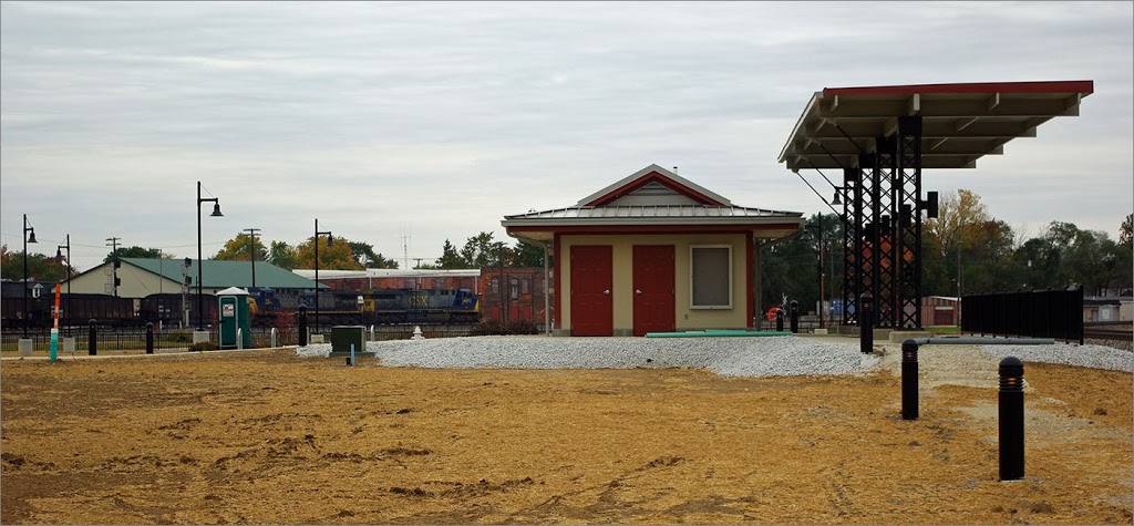 3. Railfan Park: Development of the viewing platform, washrooms, and the parking lot is well under way in this photo taken by David in late October of this year, as a CSX Westbound train sneaks by.