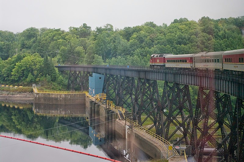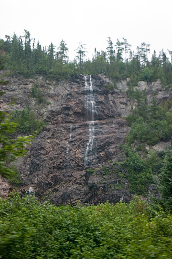 The Agawa Canyon is a shallow canyon located deep in the sparsely populated Algoma District in the Canadian province of Ontario. It was created 1.2 billion years ago by faulting along the Canadian Shield and then enlarged by the erosive action of the Agawa River. The Agawa Canyon Wilderness Park is only accessible by hiking trail or the Algoma Central Railway, and is located 114 rail miles north west of Sault Ste. Marie. At their highest point, the walls of the canyon rise 175.2 meters (575 ft) above the river.