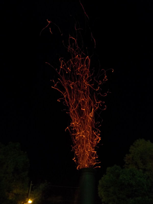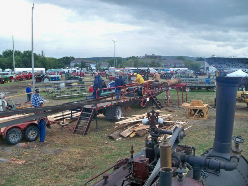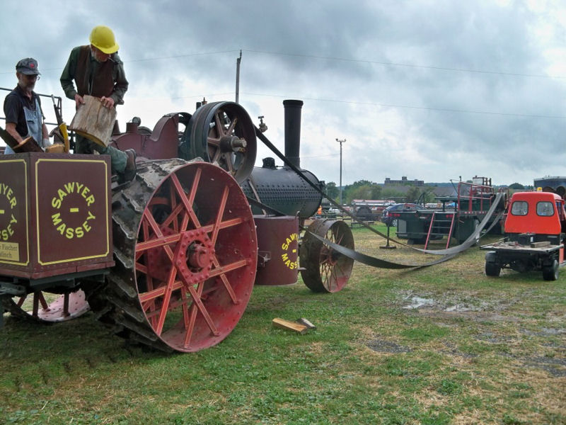 For part of the four day event, the tractor was also used to power a sawmill through the use of a long belt as shown in the photos below. Throughout the weekend there were demonstrations underway of the sawmill in operation. In the final photo at the lower right, we see a shot of the traditional “spark shows’ put on by the steam tractor operators each evening.