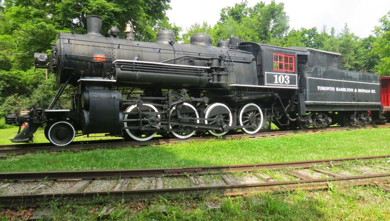 We were impressed with the village but our specific interest was to see and photograph what we believe is the only preserved Toronto, Hamilton and Buffalo (TH&B) steam locomotive – #103. Originally rusting away in Gage Park in Hamilton, it was moved to Westfield Village in 1977 and cosmetically restored. Also part of their railway artefact display is TH&B Caboose #58 and the TH&B Jerseyville Station.