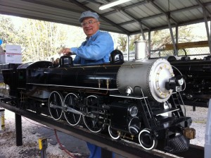 In one of the photos, young Riley, a member of the Golden Horseshoe Live Steamers of Hamilton vacationing with his family, drives Michael’s small electrically powered “critter” which Michael brought with him to Florida to run on the Florida tracks.