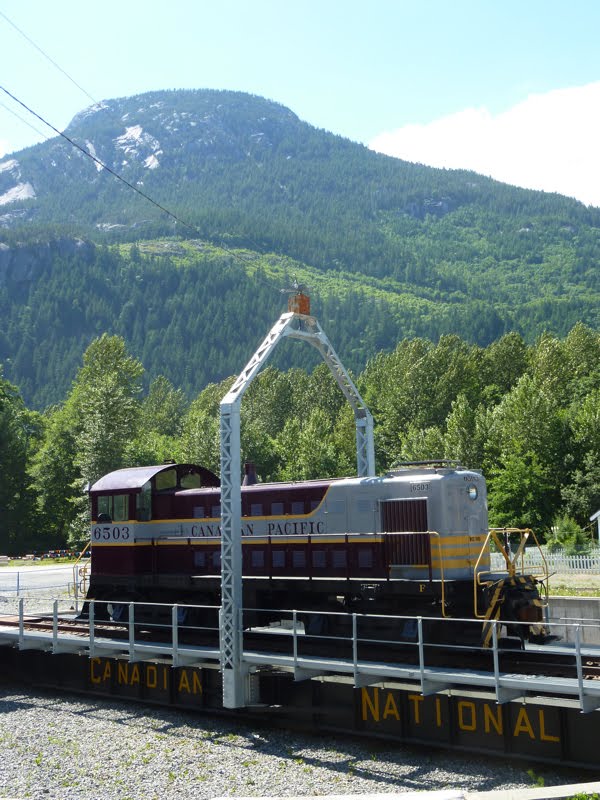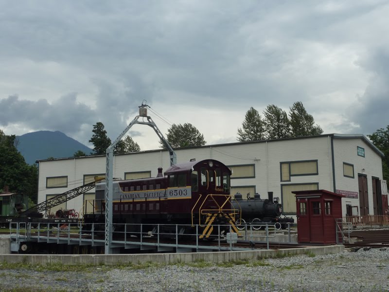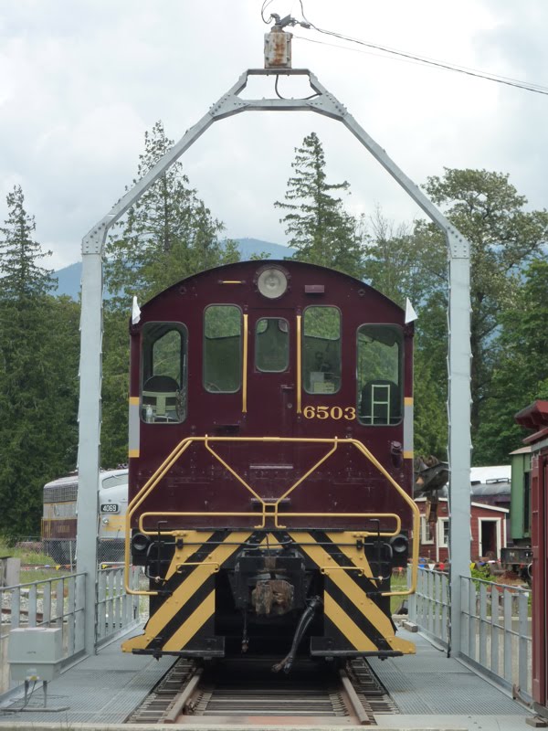 Sitting on the turntable is their CPR #6503 Montreal Locomotive Works (MLW) S-3 switcher in the appealing maroon and grey CP paint scheme. It was built in May of 1951 and served the CPR until 1983 when it was sold to the United Grain Growers. It then operated in their Vancouver terminals until 1987 when it came in the possession of the West Coast Railway Association