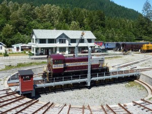 Continuing our field trip to the West Coast Railway Association’s museum in Squamish, B.C. we now focus on the turntable area adjacent to the new roundhouse. It is about 96 feet long and electrically driven. It is just long enough to hold their CPR Royal Hudson steam locomotive. The normal storage track for the Royal Hudson in the roundhouse lines up with another yard track at the other end of the turntable allowing them to make a straight pull of the locomotive into the yard without having to steam her up.