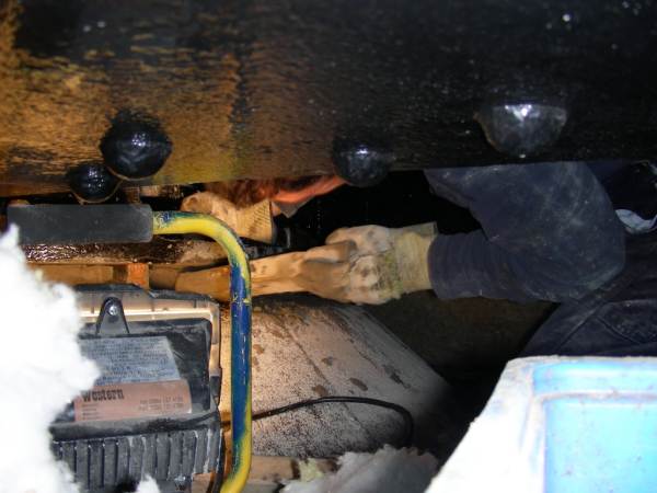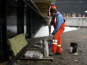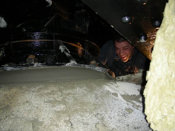 On December 22nd, two technicians from Western Mechanical mixed cement grout and packed it in under the turntable pivot base to provide the permanent support. That’s Nick mixing and Rob working in the confined space below the turntable centre. Last Friday, December 28th, Rob and I took the table for a test spin and timed it at approximately one minute, forty-five seconds for a 180 degree rotation.