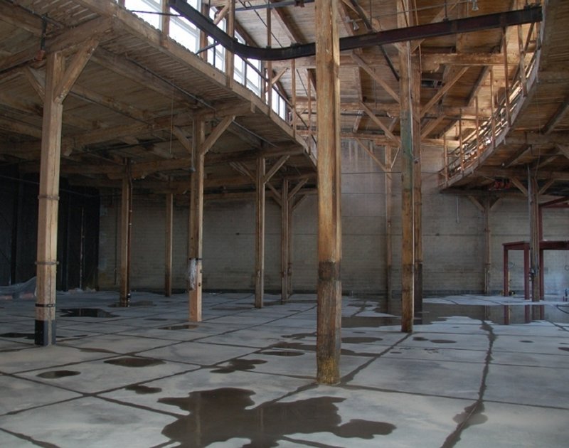 In prior news items, we described the covering of the original floor with a new concrete cap to provide a base for the new Leon‘s store space. In the picture at the left above, we see this finished floor with a pattern of cuts in it to provide expansion joints to accommodate expansion and contraction of the floor. In the middle left picture we see the floor surface after being ground smooth. In the middle right picture, the floor has been further polished. In the right hand picture, note that some of the expansion joints have been carefully placed to follow the path of the rails to the roundhouse doors, a nice touch.