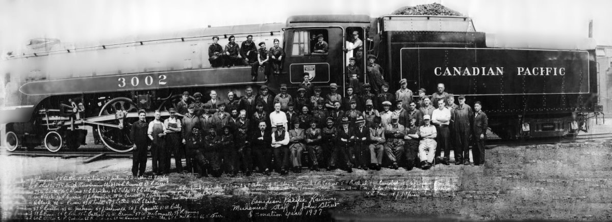 “While talking to a co-worker of mine about the roundhouse he mentioned that his grandfather, Rubin Kerr, had worked there. He also mentioned that he had a group photo that belonged to his grandfather of the CPR Roundhouse mechanical Staff in 1937 posed in front of a CPR steam