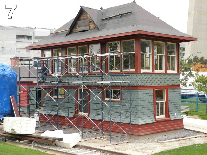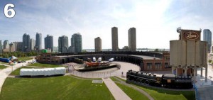 #6: In a tribute to the excellence of the Roundhouse restoration project, Don Loucks, heritage architect with IBI Group, was awarded the 2009 Canadian Association of Heritage Professionals (CAHP) award for adaptive reuse of a heritage building for his work on the John Street Roundhouse. In this photo, we not only see the Roundhouse but also the Roundhouse Park property which was significantly redeveloped with many full standard gauge radial tracks being installed in 2009. Click here and here for more information.