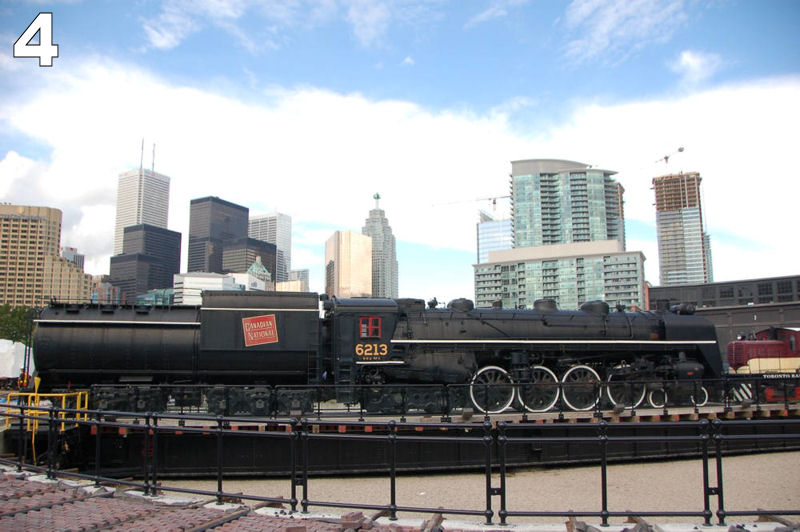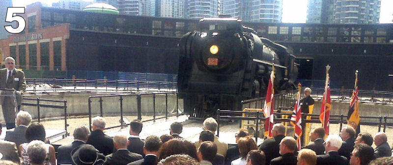 #4: In June of 2009, our massive CNR 4-8-4 Northern Locomotive was successfully returned to Roundhouse Park from the CNE Grounds in an exciting overnight journey witnessed by many. In this image we see it happily residing on the last remaining 120 foot turntable in Canada. Click here and here and here for more information.