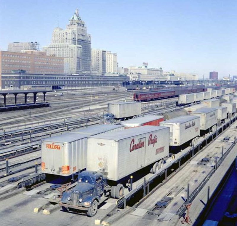In 1952, the CPR began a service to transport truck trailers between Montreal and Toronto on specially designed cars. This was known as a piggyback service. These initial forms led to the much more sophisticated systems used today to move containers by ship, rail and road. These are called intermodal transportation systems.