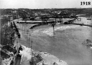 Every spring, railway facilities along the banks of rivers can be threatened by the breakup of ice, formation of ice dams and the subsequent overflowing of the river onto its banks. The Don River was no exception. From the Archives of the City of Toronto, we find the photograph above from 1918 showing the railways in the lower Don Valley submerged in water. In the photographs below, we find railroad crews clearing ice from the railway alongside the Don River after just such flood earlier in 1910.