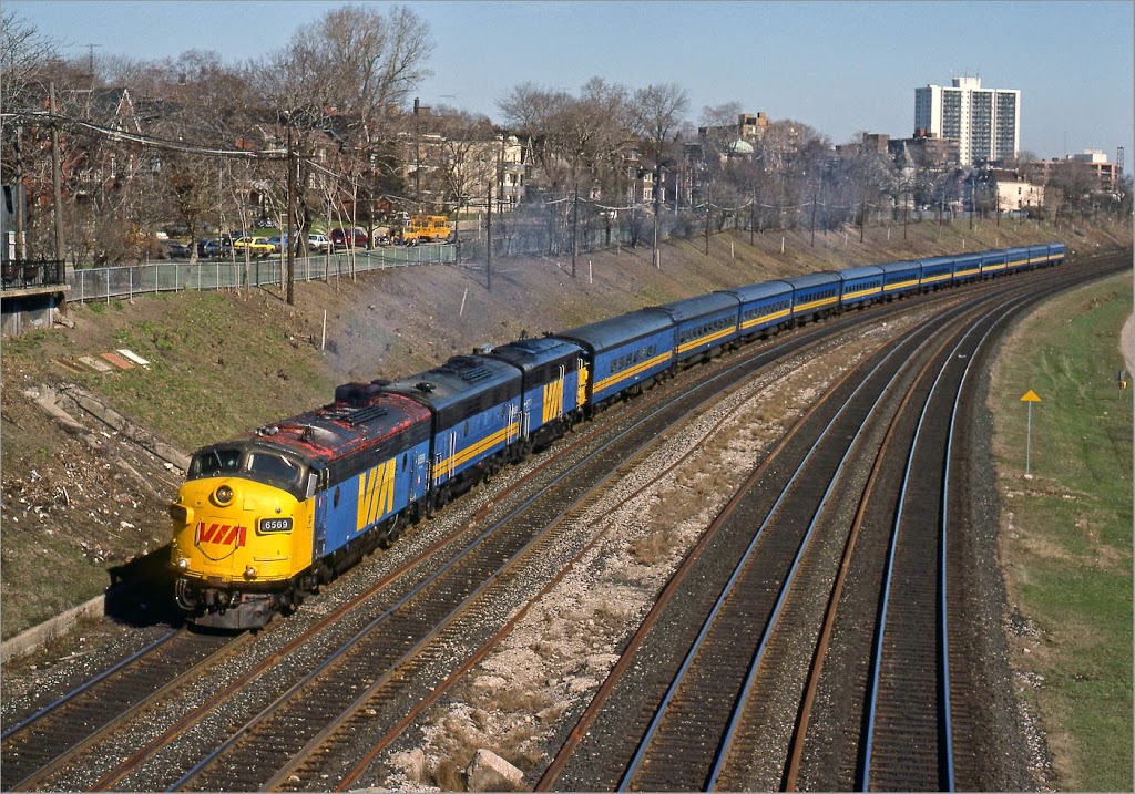 Sunnyside April 1988 6569: A nicely matched ABA set of VIA hand-me-downs from CN and CP accelerate #75 with 12 coaches past the former side of Sunnyside Station. The heritage of lead unit 6569 is quite evident with the CP red bleeding through on the roof. Note the inner two mainline jointed rail tracks are about to be upgraded with continuous welded rail.