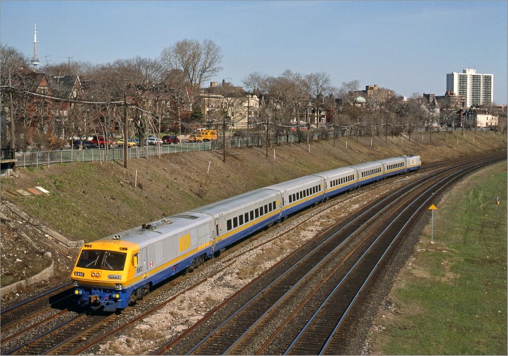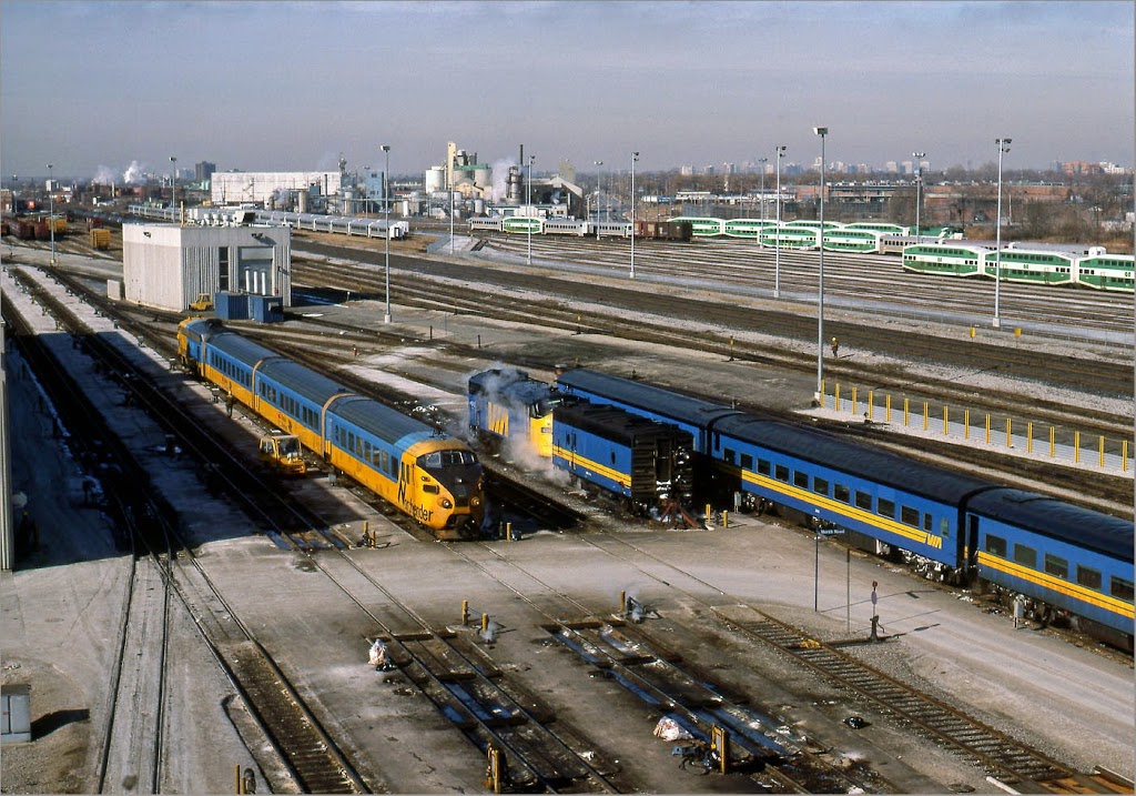 Toronto Maintenance Centre May 1988: The VIA Toronto Maintenance Centre (TMC), as viewed from the Islington Ave bridge, always had interesting equipment. In the view today looking Westward, are an Ontario Northland “Northlander”, and a VIA cab unit / steam generator car steaming away before the passenger car fleet was completely converted to electric heat. Lots of original single decker GO coaches in the background, before the bi-levels took over.”