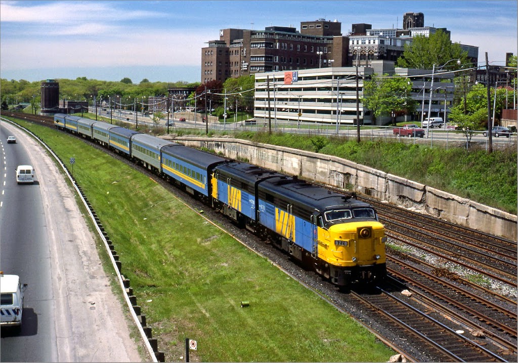 Sunnyside June 1988 6776: A matched pair of VIA FPA-4’s are about to arrive at Toronto Union Station, with seven mixed conventional and stainless steel coaches.