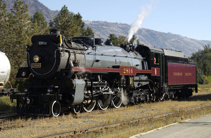 Canadian Pacific 4-6-4 Hudson No. 2816 begins excursion service after three years of restoration. Built in 1930 by the Montreal Locomotive Works, the steam locomotive operated in the Toronto area in the late 1940s and had last seen regular service in 1960 hauling commuter trains in the Montreal area. In 1963, it was sold to Steamtown in the United States and remained in storage until repatriated by Canadian Pacific in 1998. Of the five CP H1 Hudsons to be preserved, 2816 is the only surviving non-streamlined locomotive of its class. Following three years of restoration at the BC Rail shops in North Vancouver, the engine was named the CPR Empress, an homage to the capital steamships operated by the company for many years. CP uses the locomotive as a roving corporate ambassador, often to raise funds for the Breakfast for Learning Foundation. In 2003 and 2004, No. 2816 visited Toronto and hauled the first and so far only mainline steam excursions out of the city since 1980.”