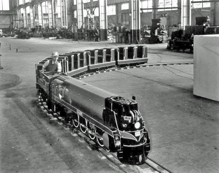 “Another popular miniature railway remembered fondly by Torontonians who grew up in the years following World War II was the Toyland Treasure Train at Eaton’s department store on Queen Street. The train was hauled by a replica of Canadian National Railway’s streamlined No. 6400 steam locomotive introduced in 1936 and still the most modern passenger engine in Canada, since new locomotive development had virtually halted during the war. The scale locomotive was built by CN’s Point St. Charles shops (see image at above left) in Montreal as they geared down from war production and were preparing the transition back to peacetime. Children paid a quarter to ride the train through the Rocky Mountain Scenic Canyon, Doll Land, Topsy Turvy Town and Santa’s Northland Castle. In 1956, Eaton’s replaced the engine with a miniature diesel locomotive. The original 6400 replica is now on display at the Canadian Railway Museum near Montreal. (see the middle image above).”
