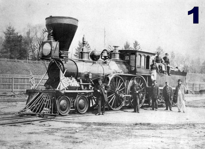 #1 – Northern No. 3, decorated with Union Jacks and deer antlers, poses on the turntable south of Front Street circa 1860. In an era when railway engines received individual names, this was the ‘Josephine’, probably named for or by its longtime engineer Josiah Huckett, the dapper looking gentleman seen leaning on his engine. With its enormous 72″ driving wheels, this was the fastest engine in the NRC roster.