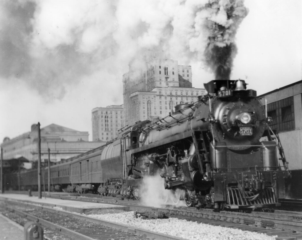 Canadian National took delivery of brand new 4-6-4 Hudson type steam locomotives in 1930, a wheel arrangement pioneered by the New York Central Railroad. These engines were designed specifically for fast passenger service on mainlines, and they would spend their first decade on Canadian National’s high-priority named passenger trains. The first locomotive in the series, number 5700, hauled its first revenue train out of Union Station in 1930. The train was greeted with much fanfare along the way to its destination of Windsor, Ontario, even becoming delayed by crowds in some cities. While Canadian National would ultimately consider these engines inferior to their 4-8-4 Northern types delivered in 1927 and 1929, the Hudsons were well suited to the shorter passenger train lengths used during the Great Depression. Only five Hudsons were built for Canadian National, and all would be assigned secondary duties once the depression ended and train lengths increased.