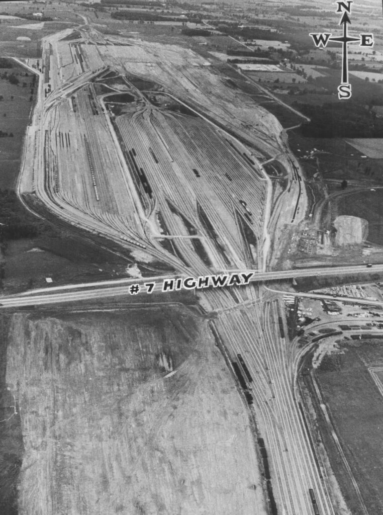 Simultaneously, Canadian National engaged in efforts to overhaul their freight terminals in the Toronto area. Even as the trucking industry took more of the railway’s market share, freight shipments remained the more profitable side of the market compared to passengers. On February 6th, 1965, Canadian National opened a new freight marshalling yard 20 kilometers northwest of downtown Toronto. At the time of its opening the surrounding area was mostly farmland, and the decision to consolidate freight facilities here would allow most CN freight trains to bypass the city altogether. The rail yard cost $75 million to build, and it was the second largest of its kind in Canada behind another CN yard in Winnipeg, Manitoba. Originally called Toronto Yard, it was renamed MacMillan Yard in 1975 after former CN president Norman J. MacMillan. The construction of this new classification yard would result in the gradual disuse of the existing freight yards on either side of Toronto in Danforth and Mimico as operations were moved to Vaughan.
