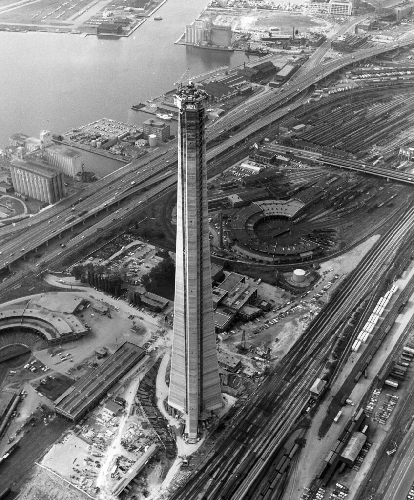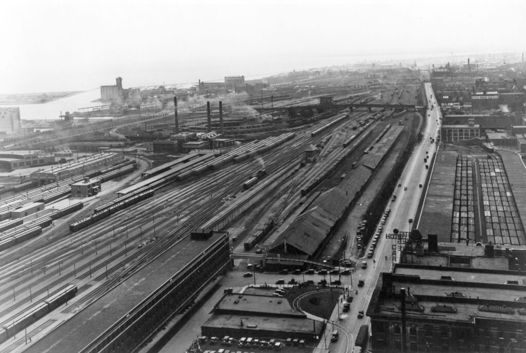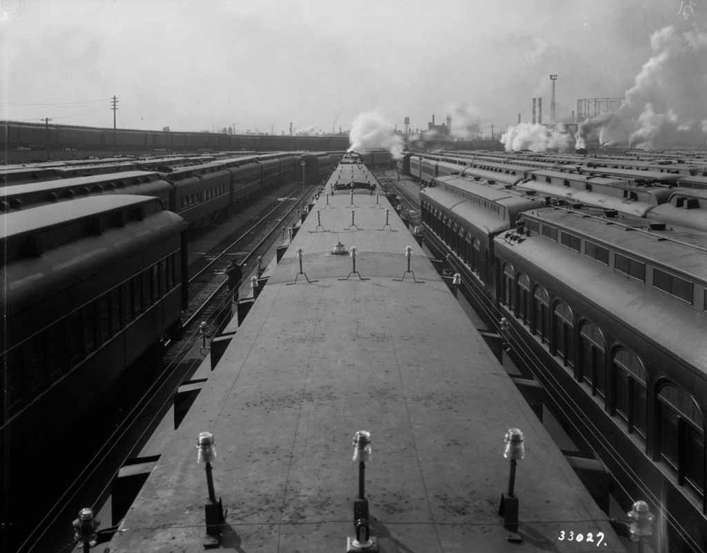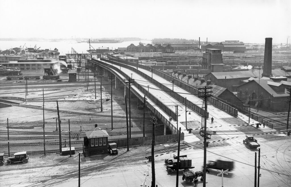 Canadian National would enter the Great Depression on a relative high note, having opened Toronto’s new Union Station in 1927 and the elevated rail corridor in 1930. The new corridor was thoroughly tested with the heaviest locomotive available, one of Canadian National’s 2-10-2 Texas type steam engines delivered in 1924. It included three new interlocking towers to manually govern the switches and signals at Cherry Street, Scott Street, and John Street. A fourth tower called Cabin D which dated back to the 1890’s was kept and adapted into the new rail corridor’s interlocking system. Coinciding with the new corridor, the Spadina Roundhouse and coach yards were opened by Canadian National in 1927, officially referred to as the Toronto Locomotive and Car Facilities. Located approximately a kilometer southwest of Union Station, the facility was designed specifically to service passenger trains while between trips.