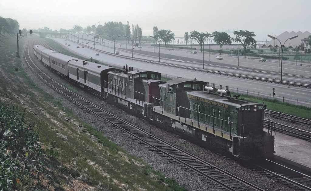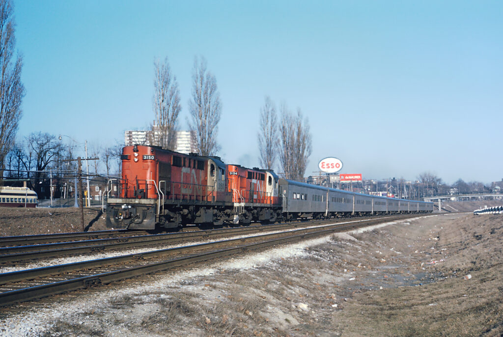 Simultaneously, Canadian National was expanding their regional service elsewhere into what would eventually form the routes currently operated by VIA Rail. An intercity passenger train called the Rapido was introduced on October 31st, 1965, originally just operating between Toronto and Montreal. Its route was extended beyond Montreal to Quebec City in 1966, then subsequently extended further to Windsor, Sarnia, and Ottawa. These trains primarily used conventional diesels and passenger cars from the 1950’s that had been repainted or refurbished. For southwestern Ontario, the Tempo Train began operating between Toronto, Windsor and Sarnia on June 17th, 1968. These trains featured new Hawker-Siddeley passenger cars and several locomotives were repainted into a unique colour scheme to match.