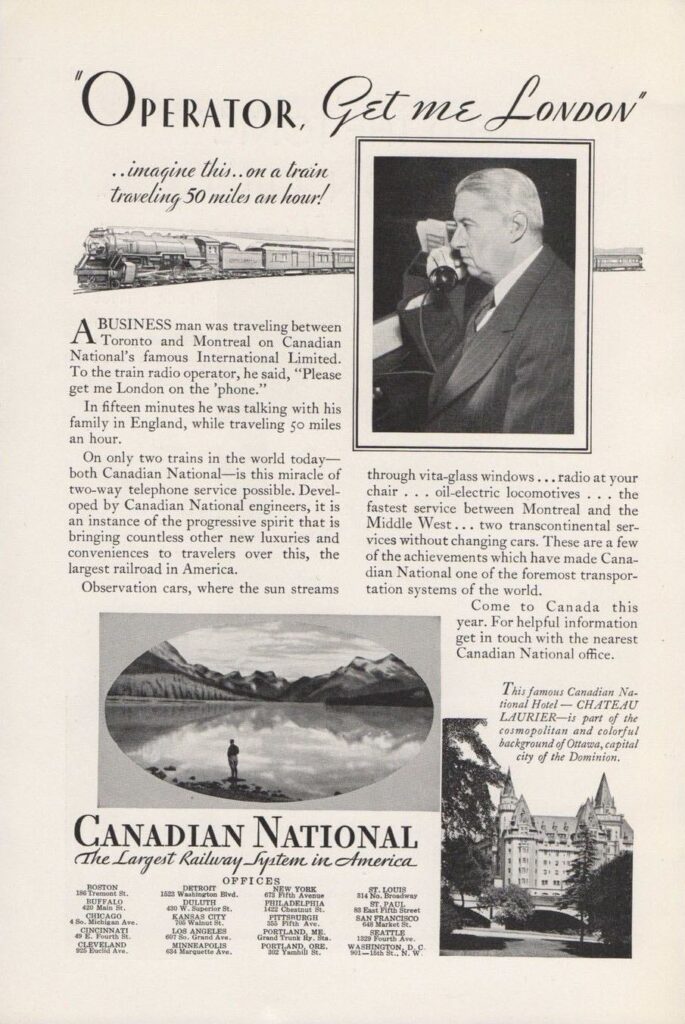 Thornton then began an effort to aggressively compete with Canadian Pacific directly, which mostly manifested with the passenger service offered between Toronto and Montreal. This was done through the replacement older equipment used on that route with new ones that could operate at higher speeds. A total of twenty-one 4-8-2 Mountain type steam locomotives were purchased and delivered from the Canadian Locomotive Company in Kingston, Ontario in 1923. This was followed by an additional fifteen in 1924, and another five that were built by the Baldwin Locomotive Works in Eddystone, Pennsylvania in 1925. These engines were significantly larger and more powerful than most of the CN fleet at the time. Some of their first assignments were on the International Limited, one of Canadian National’s express passenger trains that ran between Montreal and Chicago. The rest of the consist for the International Limited was also updated with all-steel passenger coaches. One of the more notable achievements of the CNR under Thornton was the establishment of a radio network for passengers to use while on a moving train. This network was later used by the Canadian Broadcasting Corporation in its early years. Perhaps the most revolutionary piece of technology to be developed by CN for passenger comfort was the two-way train phone in 1929, the first of its kind anywhere in the world. It used a combination of telephone and radio technology to allow passengers to make phone calls on par with any regular telephone while on a moving passenger train. It was tested by CN just north of Toronto on at least one occasion before seeing use on the International Limited. Unfortunately, the economic effects of the Great Depression led to the removal of the train phone in 1931 as it was too costly to maintain.